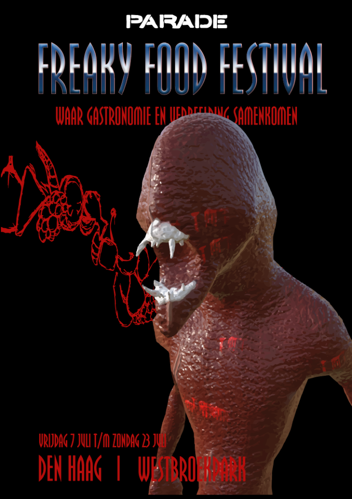 Voor school kreeg ik de opdracht om posters te maken voor het Freaky Food Festival, een fantasierijk evenement met als thema vreemd en opvallend eten. Het doel was om iets creatiefs en opvallends te ontwerpen dat goed bij dit speelse thema past.